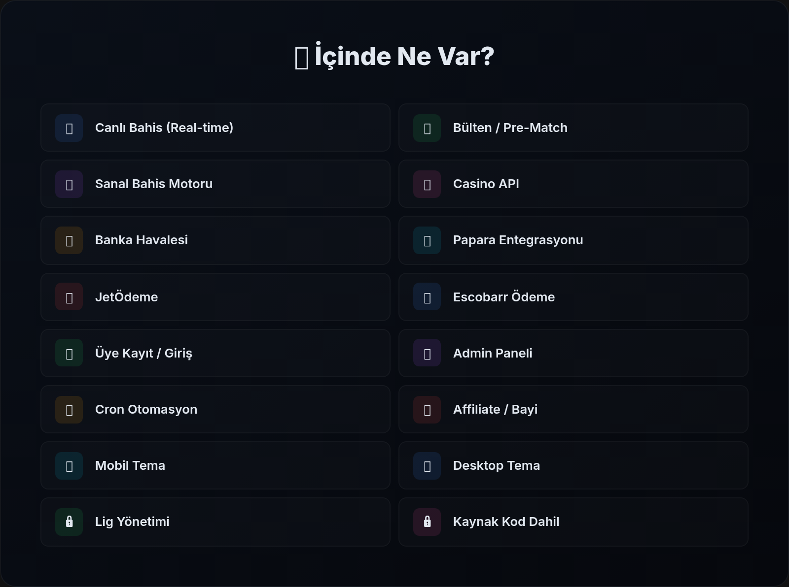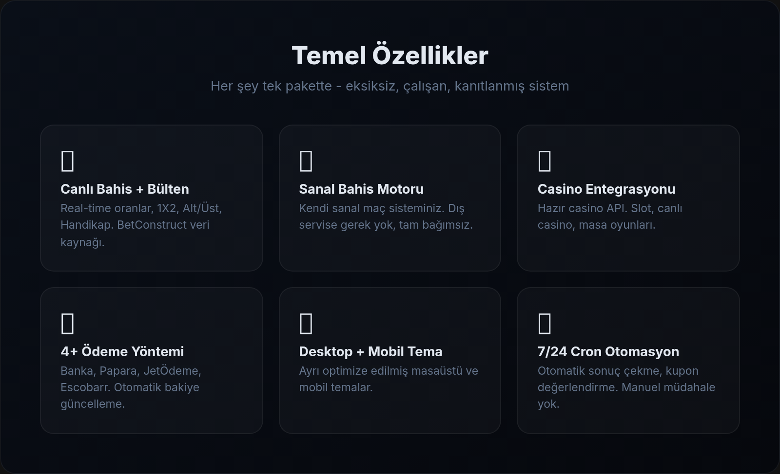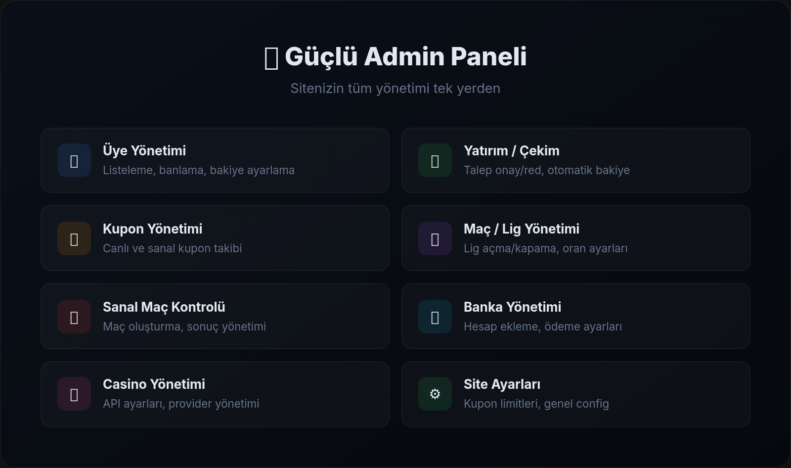 - ✅ Özgün Sanal Bahis Motoru: Dış servislere tek kuruş ödemeden, kendi sanal maçlarınızı oluşturun, sonuçlandırın ve kâr marjınızı tamamen kendiniz yönetin.