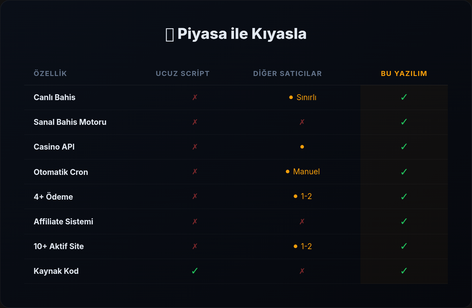 Bu sadece bir yazılım değil, anahtar teslim bir kazanç kapısıdır. Altyapımız, en yüksek trafikli dönemlerde bile donma, kasma veya güvenlik zafiyeti yaşatmadan yıllardır aktif olarak kullanılmaktadır.