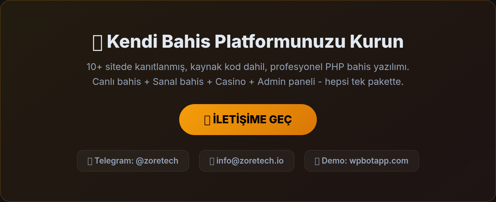 Piyasadaki sorunlu scriptlerle vakit kaybetmeyin! Zoretech olarak, 10 yılı aşkın saha tecrübemiz ve halihazırda 10'dan fazla aktif referans sitemizle, her bütçeye ve her iş modeline uygun profesyonel bahis altyapımızı sunuyoruz.